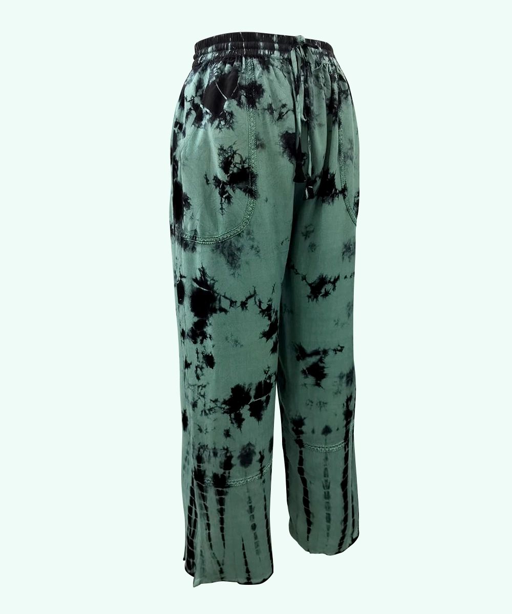 100% Rayon viscose pant trouser are designed for both comfort and style. It featuring an elastic waistband with a drawstring for an adjustable fit. The pants include practical pockets on the both sides, lined with delicate lace for an elegant touch. Adding to their charm, the knee sections are also adorned with lace, creating a distinctive and eye-catching design. The entire pant is crafted with a mesmerizing tie-dye texture, making it a bold and unique statement piece for any wardrobe. Very comfortable Made in India For care, machine wash, line dry.