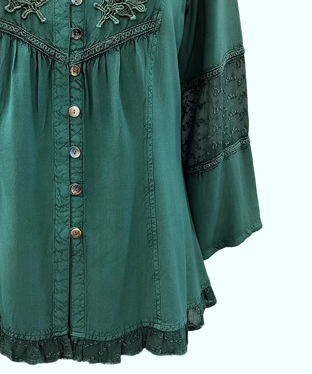 • A line of shell buttons with functional loops enhances both charm and practicality along the front placket.