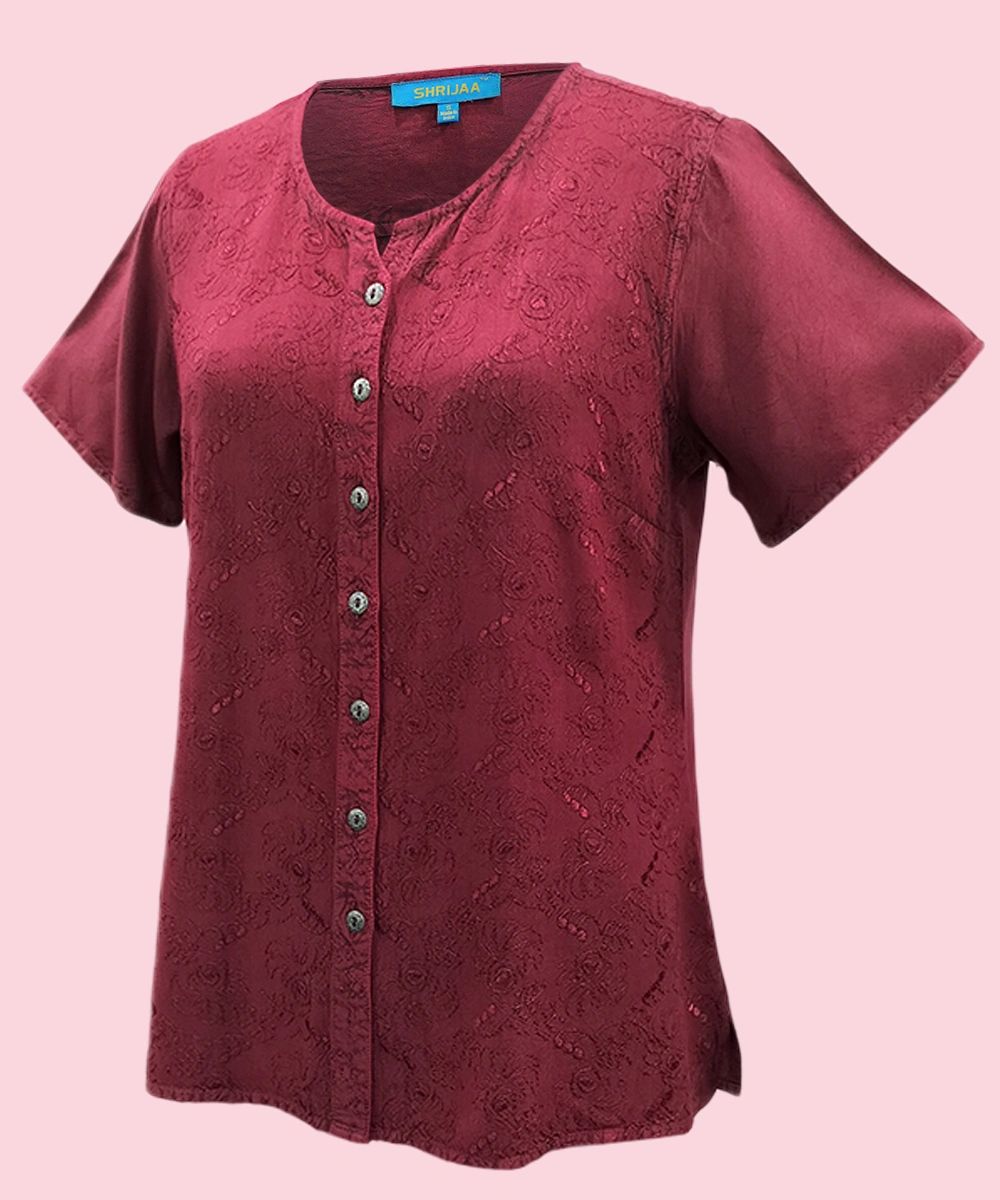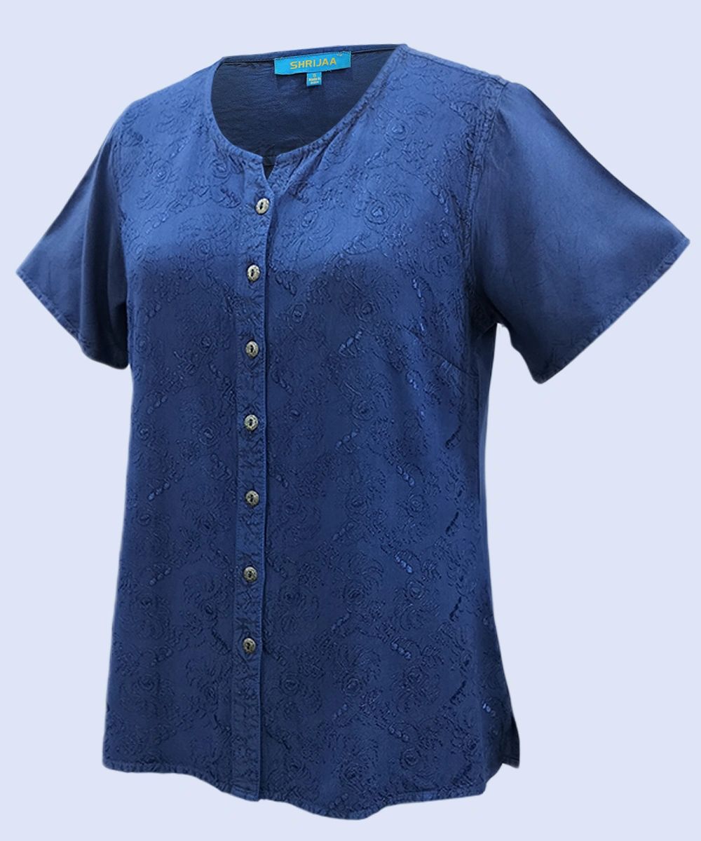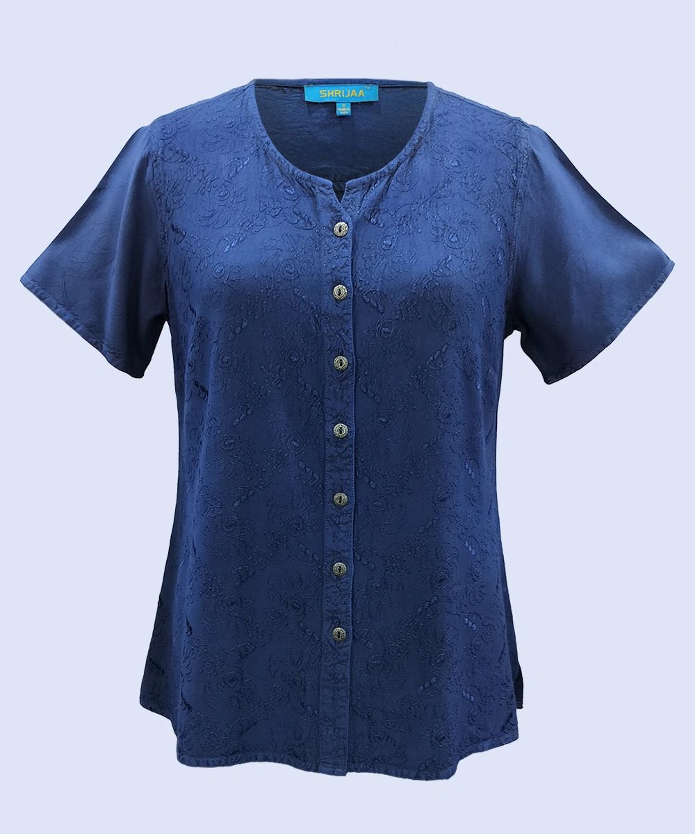 This 100% rayon women’s half-sleeve top exudes sophistication and elegance. Featuring a flattering little V-neckline, the top is designed with side slits for added comfort and a modern touch. The metallic buttons add a luxurious feel, enhancing the overall uniqueness of the design.