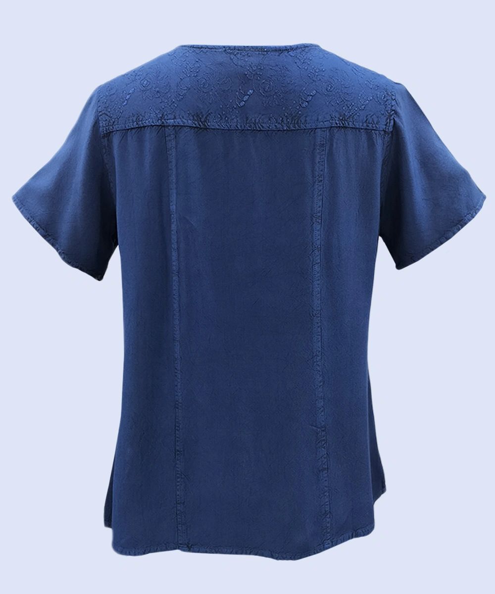 The front and back of the shoulder are beautifully adorned with intricate chicken embroidery, elevating the top with a refined, artistic flair. Perfectly blending comfort with style, this top is a stunning choice for any occasion, offering a sophisticated and distinctive look.